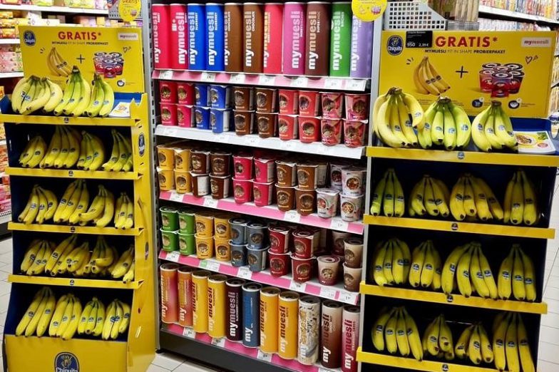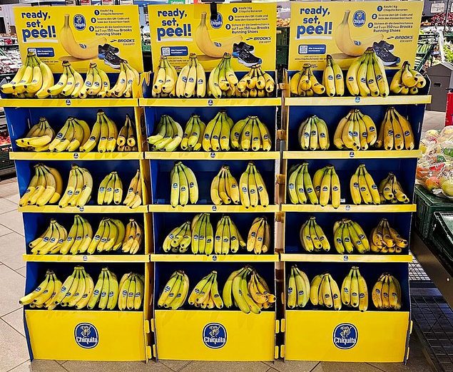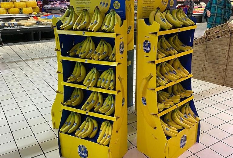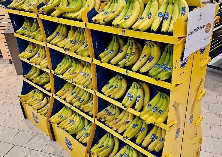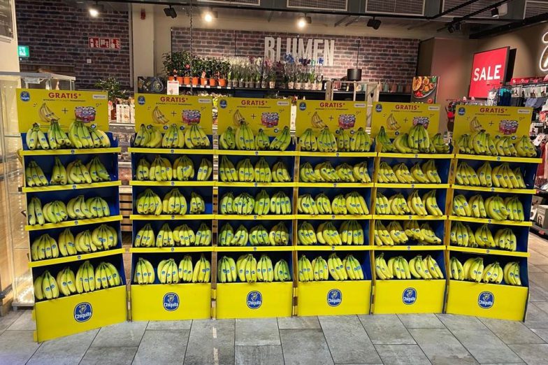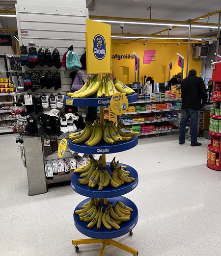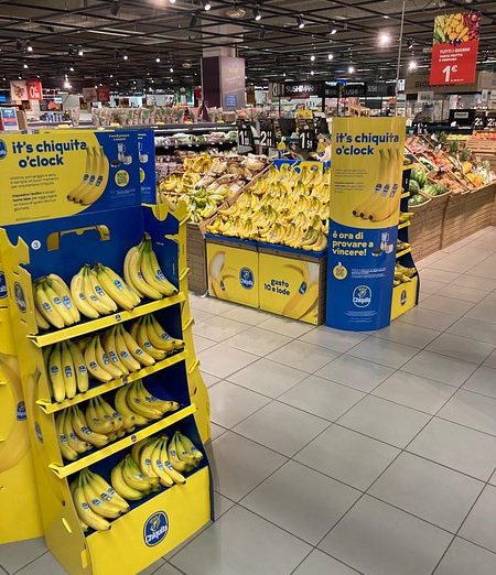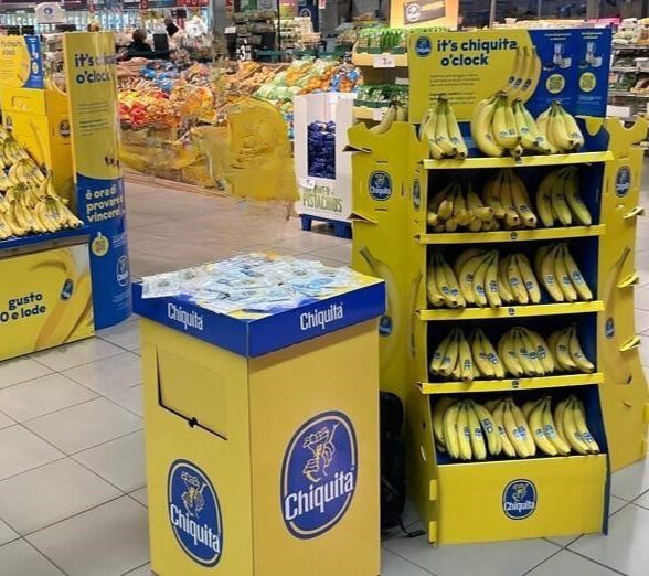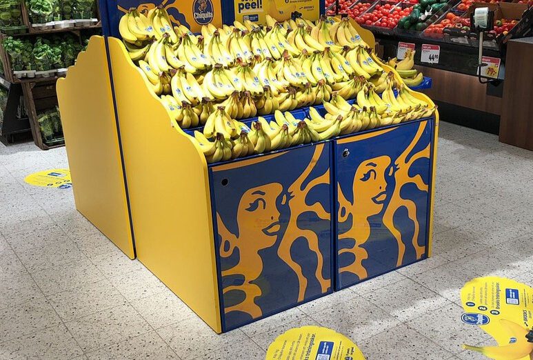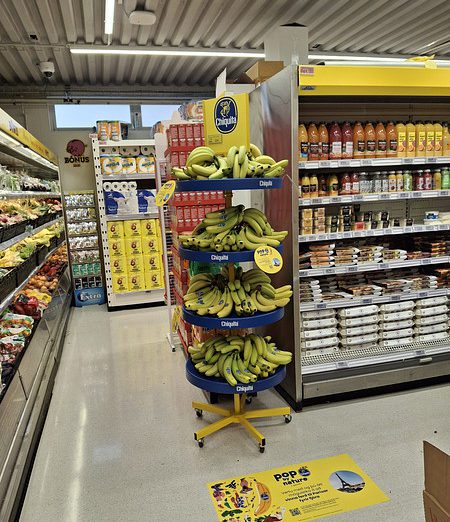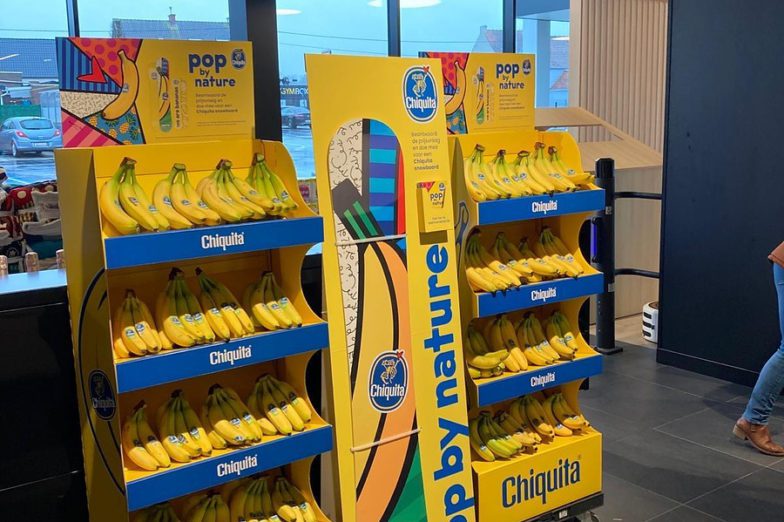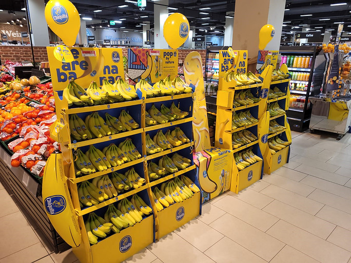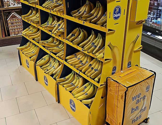 The Chiquita Mass Display Unit is a permanent, solid structure designed to deliver long-term visibility and strong shelf impact. An integrated internal storage area allows additional banana boxes to be kept inside the display, reducing the need for frequent replenishment trips to the warehouse and improving in-store efficiency. Exchangeable front posters and toppers enable the display to remain permanently installed while staying fully aligned with current campaigns.